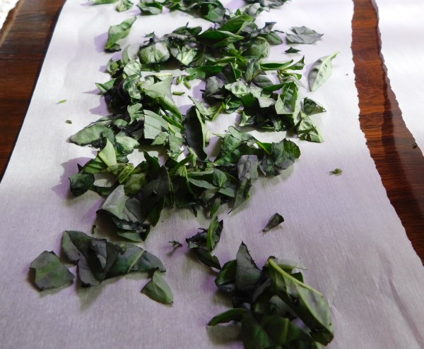 Every three days, I prune about one third of the growth. I remove the leaves, cut them into smaller pieces with scissors and spread them to dry on parchment paper. Our house is very dry and in 24 hours I can crumble the dry leaves and add them to my growing store of herbs.