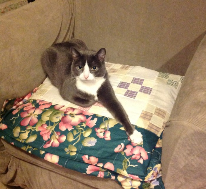 If you have read about my ‘quilting’ before, you will know that my stitches are long and uneven and they look more like basting than quilting. But my little quilts are solid. I keep them on every chair in our living room as another way of keeping the cold away!