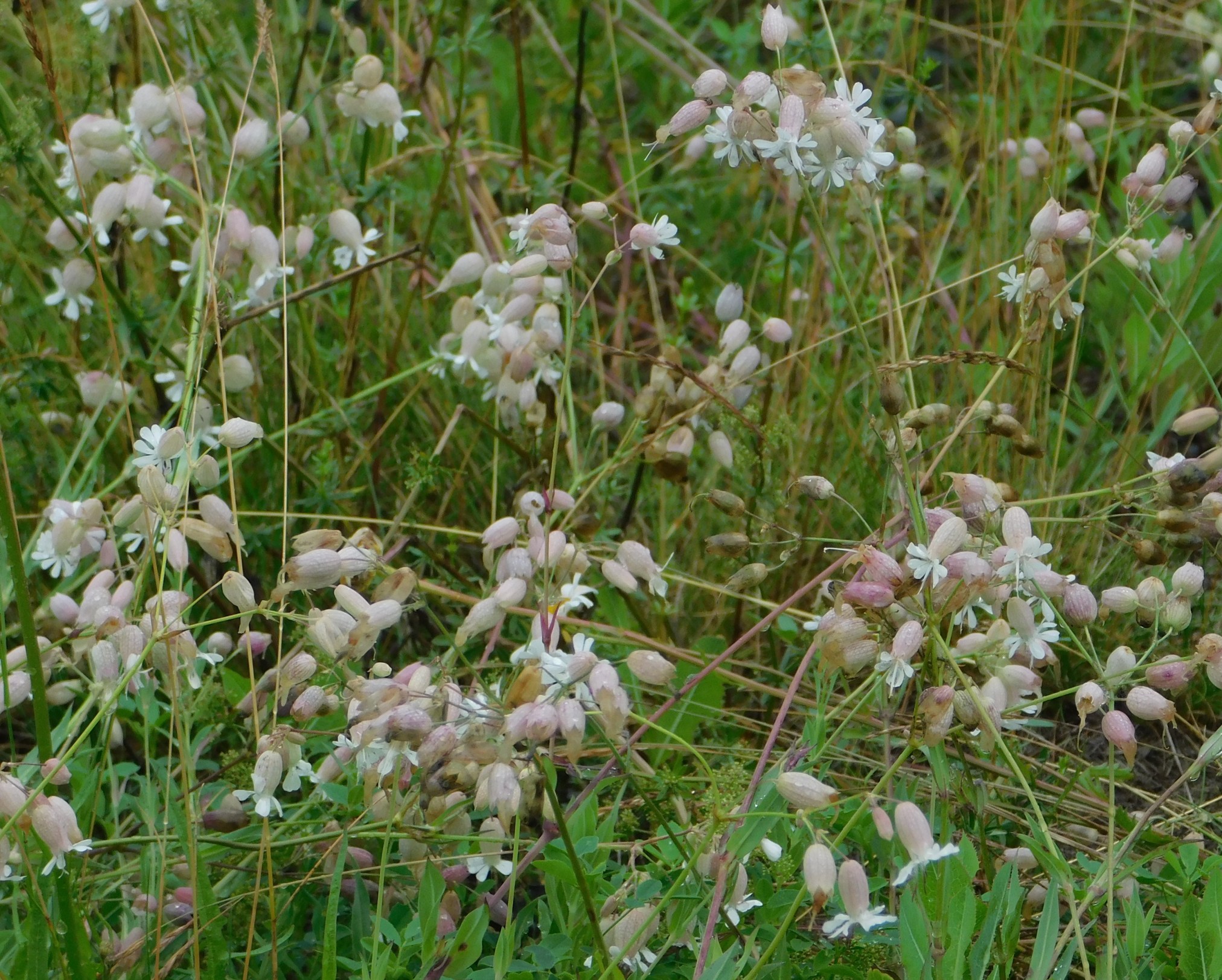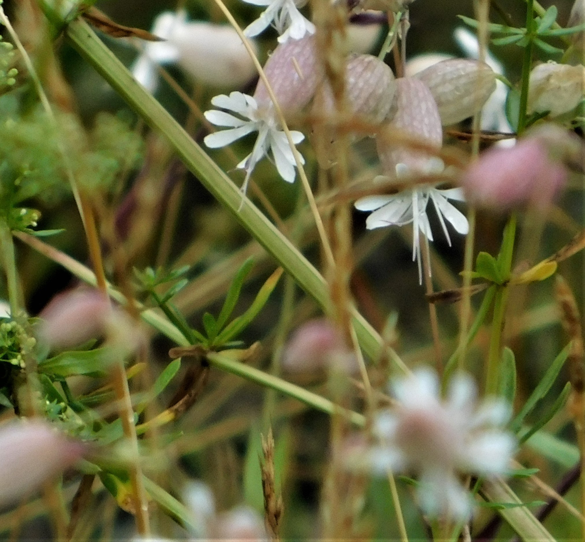 The bladder is made of fused sepals. The flower has five petals, each deeply divided into two lobes. Bladderwort campion is common, found in ditches, meadows and other waste places.