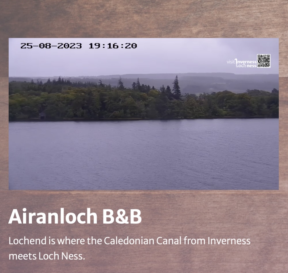 Loch Ness is a long, narrow lake (27 km long) in the Scottish Highlands. The area where I watched is at Lochend, near Caledonia Canal, the northern outlet of the Loch. The webcam panned back and forth, showing the water and land between a long narrow beach to the north and a point of land to the south (near Dores).
