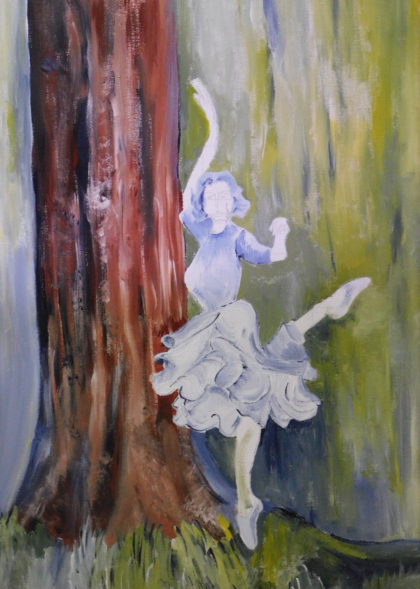 In the Urban Mystery, ‘Dancing with Trees,’ trees and dancers are central motifs. So, for the cover, I chose to paint one of the drawings in the book.