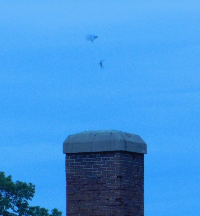 Last evening my husband and I took a drive into Fredericton to see a population of chimney swifts do their dive into a brick chimney. The chimney at McLeod Avenue provides home to a couple of thousand chimney swifts. These fleet birds nest inside brick and mortar chimneys, an ideal example of how wildlife adapts to coexist with humans. Once, swifts used large hollow trees, but these are disappearing from the landscape. When the swifts returned to Fredericton in May, a CBC newscast spread the word about the chimney and many folks turned out to watch the display CBC .