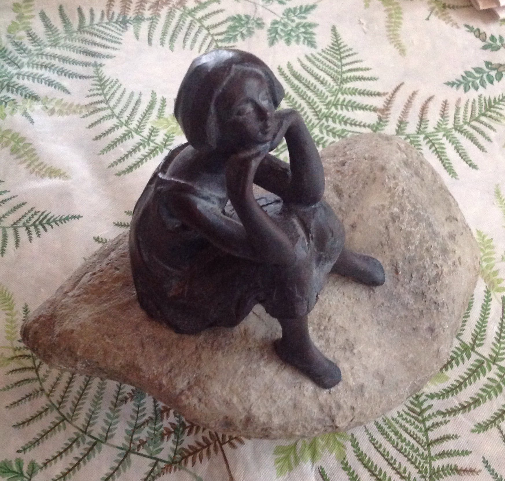 Our copper birdbath includes a silver-coloured metal bird, in case no real birds come to call. In the shade of the maple tree the water shimmers. But the little silver bird never flutters, not even a feather.