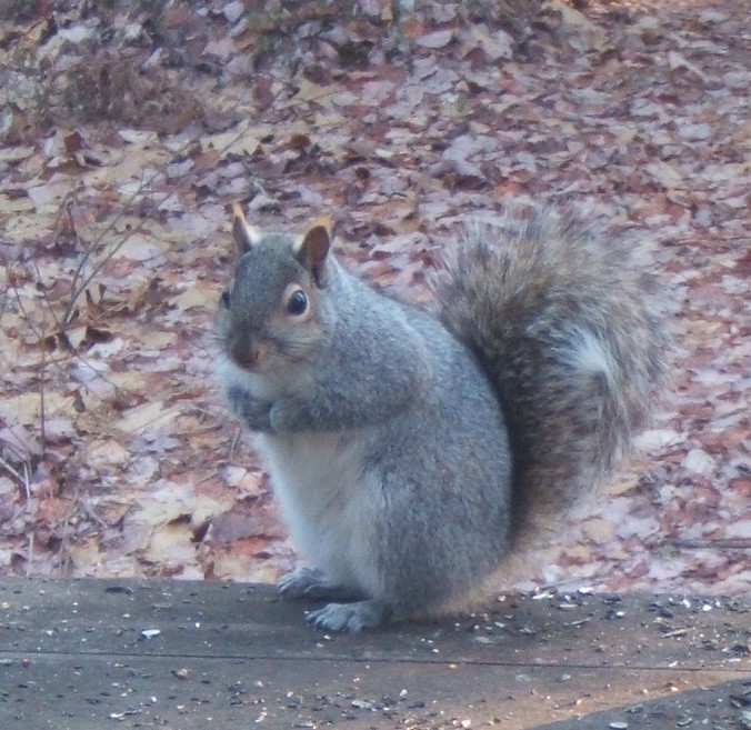I don’t mind feeding a bit to the squirrel and deer. But not the whole lot! So this morning, I altered my tactics. I put the mixed seed feeder on a hook off our deck, so high the deer can’t reach it. The sunflower seed feeder can stay in its place, but after this I will only put a quarter of the usual feed there. That way, the birds can get feed during the day and the deer can nibble on left-overs without ruining my budget. The squirrel will be able to reach the feeder on the deck, but I will lure him away with peanuts.