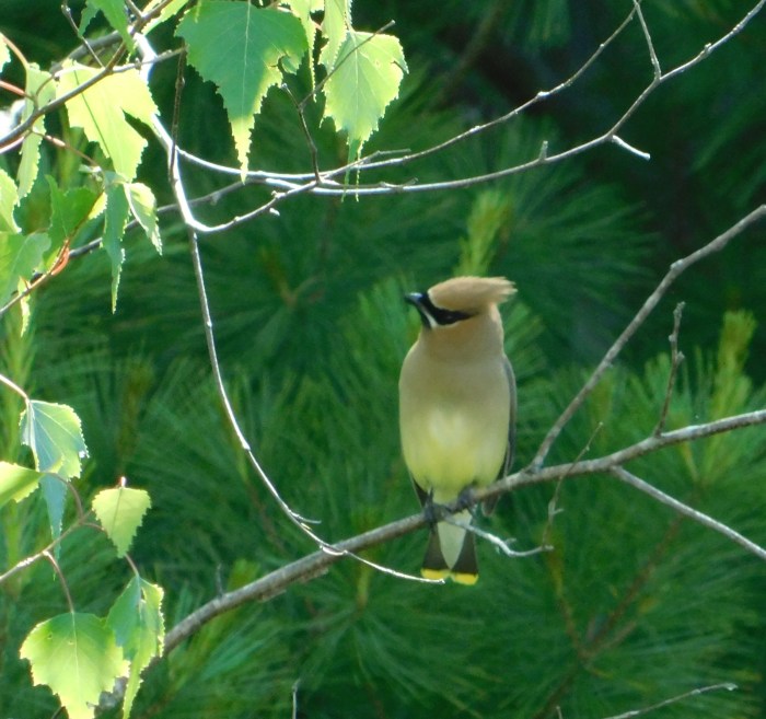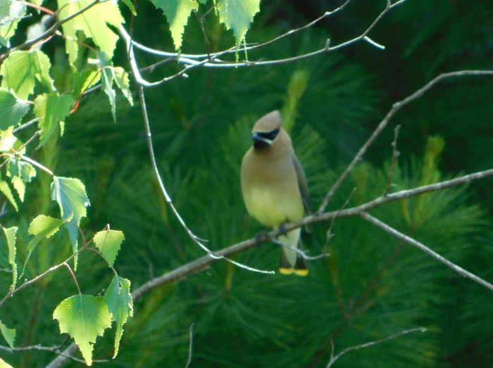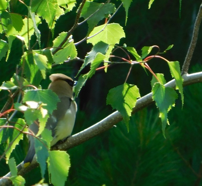 My husband identified the bird and spotted where it perched in the tree. The cedar waxwing is one of the common birds at the cabin. They love to eat fruit and we have wild strawberries, raspberries, blackberries, and blueberries on the property.