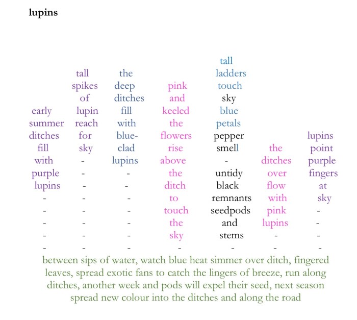 Here is a poem that goes a step further. The shape shows the shape of lupins growing in the ditch; the colours are the colours of the flowers.