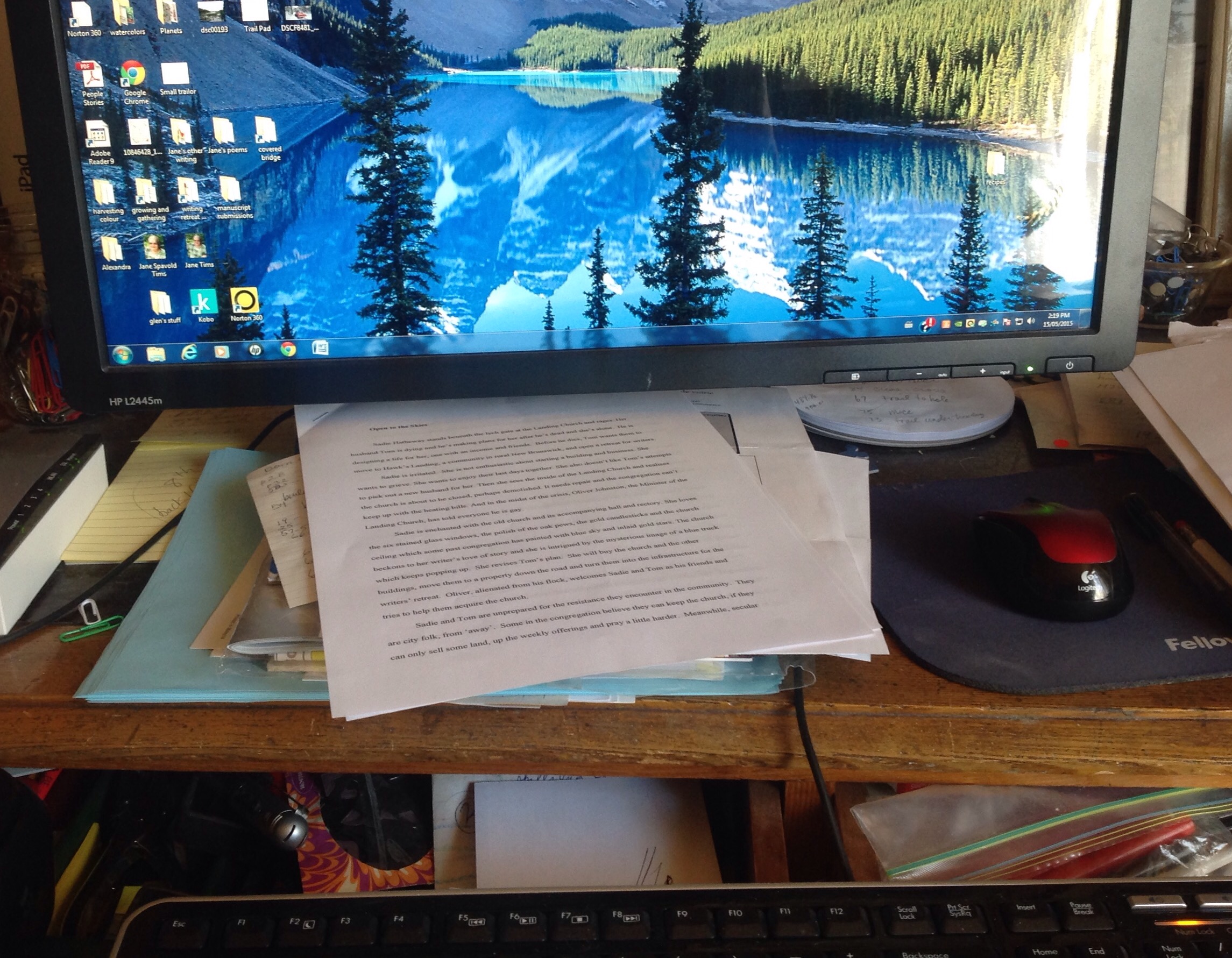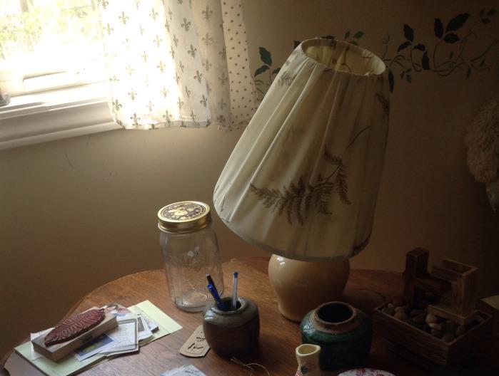 The desk in the loft is my official desk. This desk is oval and was given to me by my youngest brother – it originally belonged to my aunt. It has a lamp, a small fountain and a jar of simulated fireflies from my son. I keep a few ongoing projects here, including a stack of pages where I store tidbits of information remembered from my life. If I come across a vacation memento or a scrap of paper kept from some event, I record it here. One page per year … 61 so far. This desk is equipped for writing. Nearby is a dictionary, a thesaurus and a keyboard for my iPad. No poems or fiction, however, are written at this desk. This is the desk I clean when I haven’t written for a while.