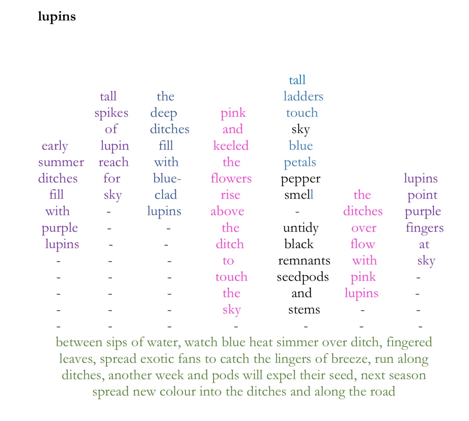 Here is a poem that goes a step further. The shape shows the shape of lupins growing in the ditch; the colours are the colours of the flowers.