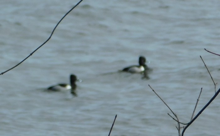 Ring-necked Duck … a terrible photo … note the grey beak with a white ring, vertical white before wing and black back …
