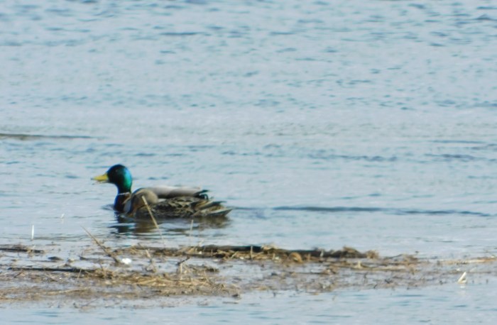 Mallards … notice the white ring around his neck and his yellow beak …