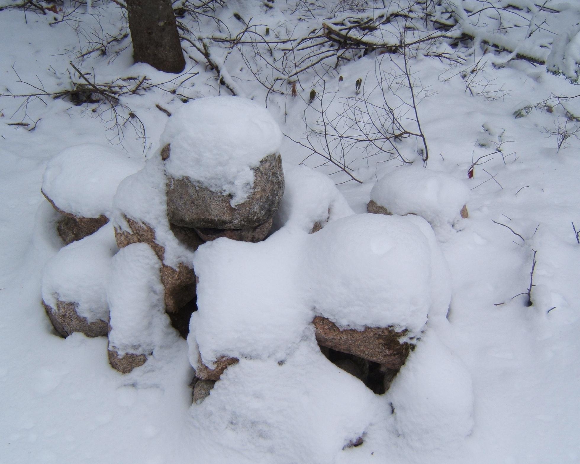 The next step will be to fell four spruce trees in the area of the firepit, to make sure we can have our fires safely. This next step may have to wait until spring since the stones are now in the frozen throes of winter!