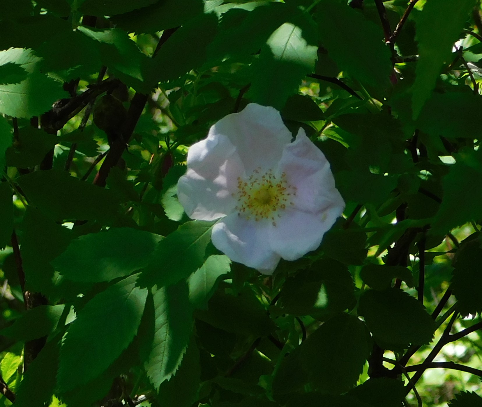 This is the swamp rose (Rosa palustris), a common wild rose in New Brunswick. You can recognize it by its pale pink flowers, its hooked spines, and its narrow stipules (winged sheaths at the bases of leaf stalks). In fall, it will have small round red rosehips.