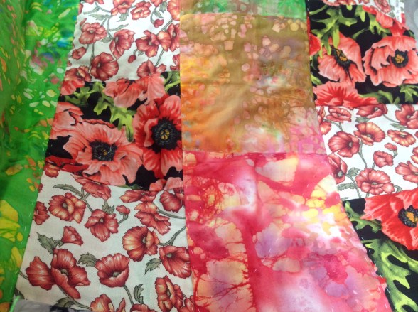 Meanwhile, I was planning to make a small quilt for our bedroom which is decorated with a poppy motif. I had some of the fabric, left over from other projects. I looked on- line and found the perfect fabric, in ready-to-quilt 5″ by 5″ squares. 42 squares, just enough for my quilt. Disappointment number 2. The fabric, when it arrived was beautiful. But, only 8 of the 42 squares were in the poppy motif! Grrrrr.