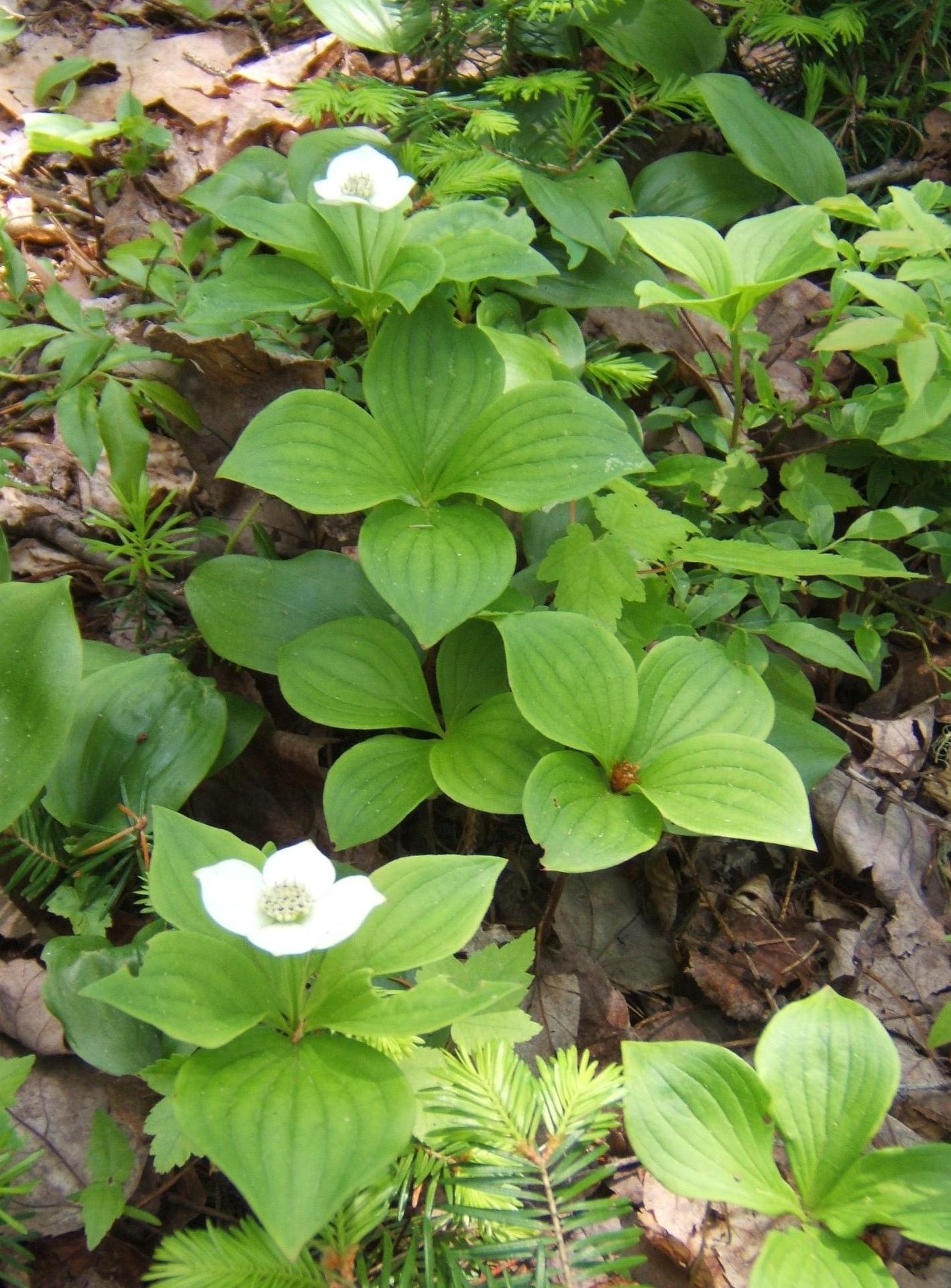 The flower of Cornus canadensis blooms from May to July and is at first greenish, changing to a dazzling white. The blossom is composed of four petal-like bracts enclosing a central cluster of tiny purplish flowers.