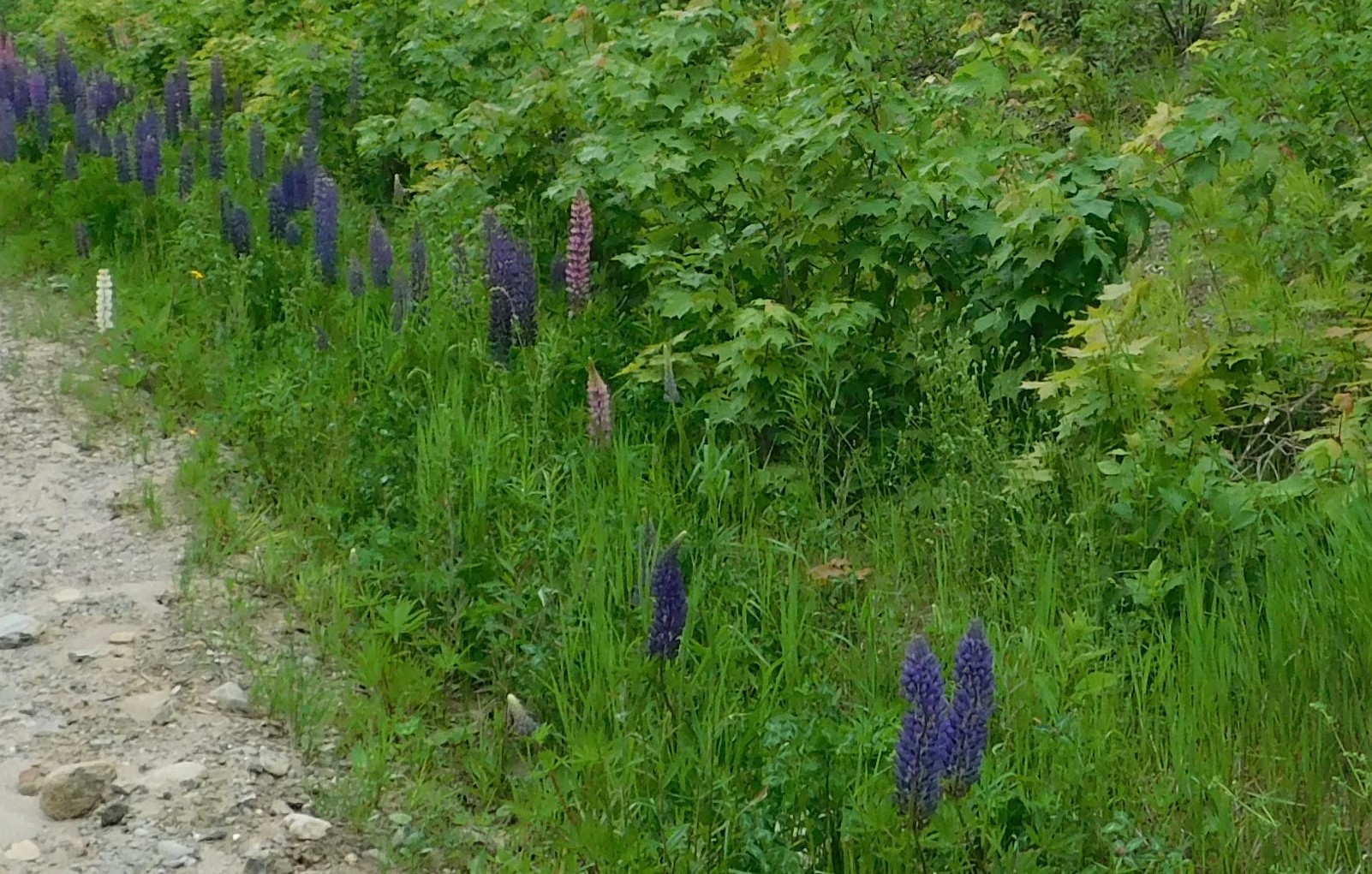 Buttercups, bunchberry, bluets and lupins fill the ditches with bloom. The lupins (Lupinus sp.) dominate – mostly purple and blue, but occasionally white, pink or even yellow. The wind was blowing so hard, you could use the flower heads and leaves to measure wind direction!