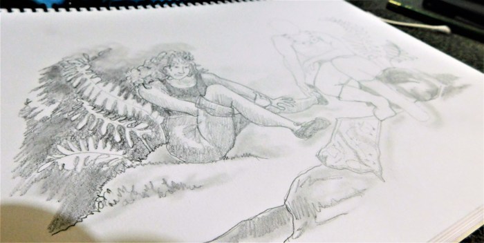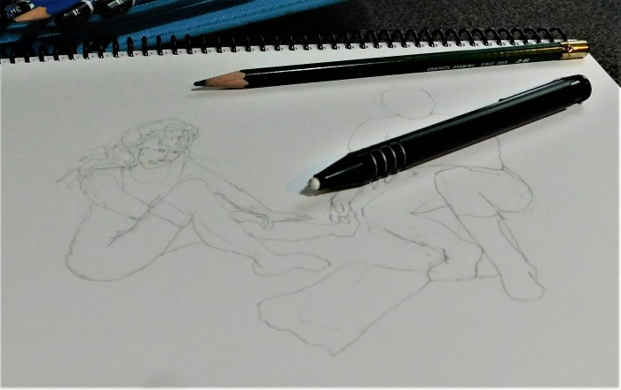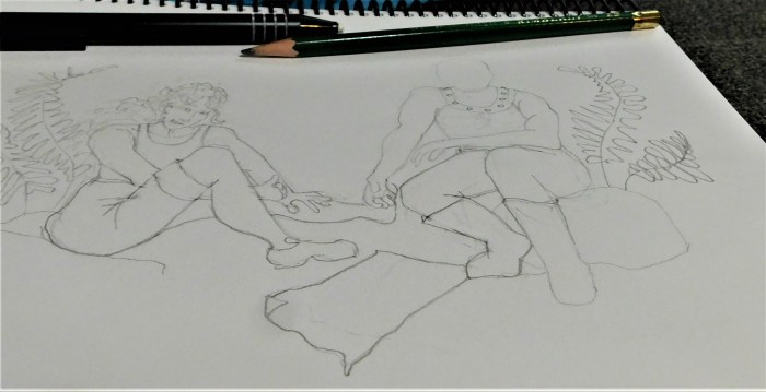 I begin with a quick sketch to establish the position of my characters. I use a 2B pencil and eraser. I think the eraser is the most useful of my drawing tools!