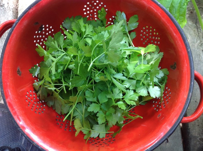 On our deck are two Veg Trugs (Lee Valley Tools used to sell them) and one bag of soil, slit open and supported on a metal frame. In the ‘gardens’ I have two snow pea plants, three yellow wax bean plants, three parsley plants and one cucumber plant.