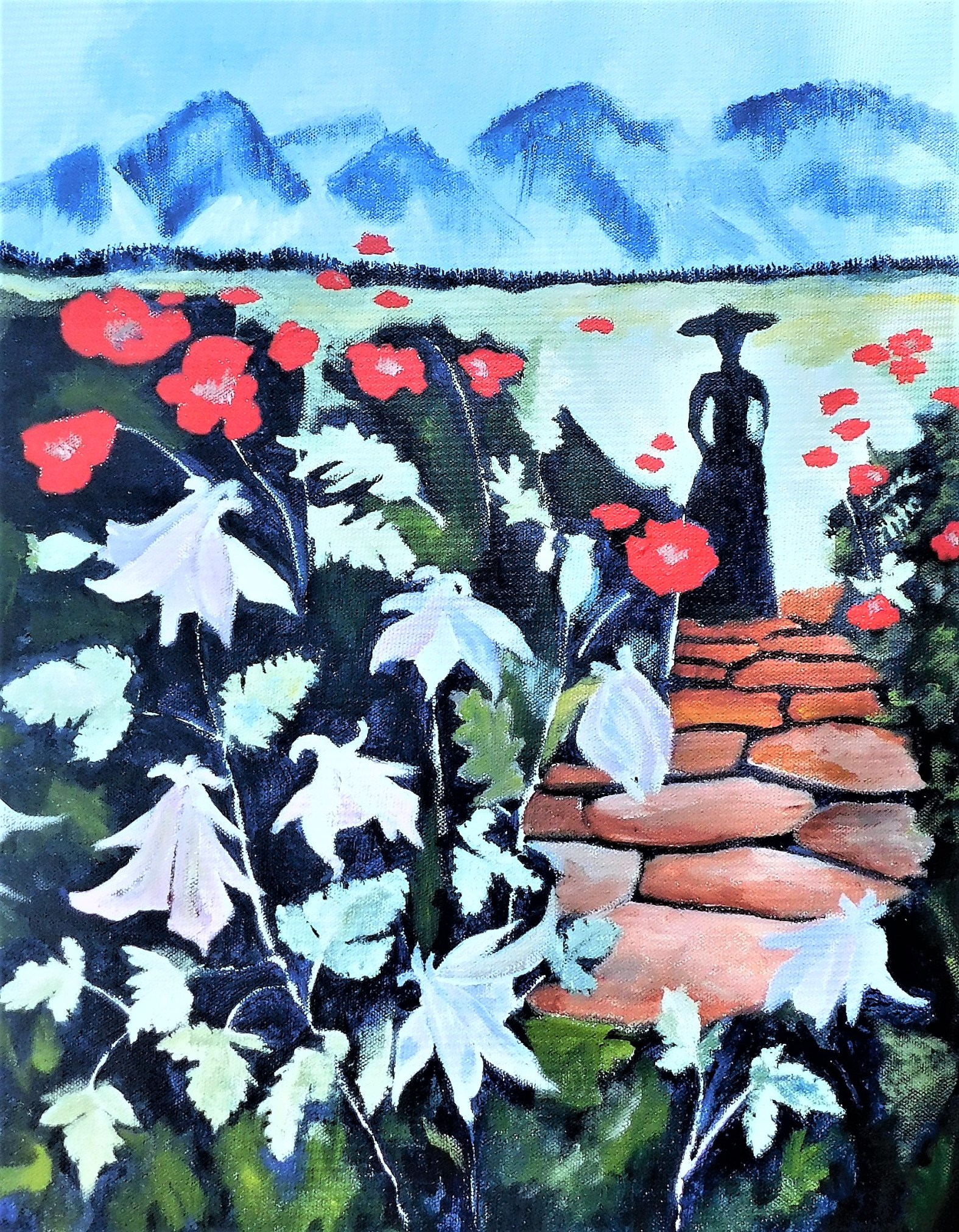I include two references to flowers in the book, to red poppies, and pink and blue columbines. So I decided early to include these flowers on the cover of the book. I also wanted to show Ella on the cover but as a silhouette, walking in the garden. I know, from my Uncle Francis’ memories, she wore wide-brimmed hats, so the figure will be wearing such a hat.