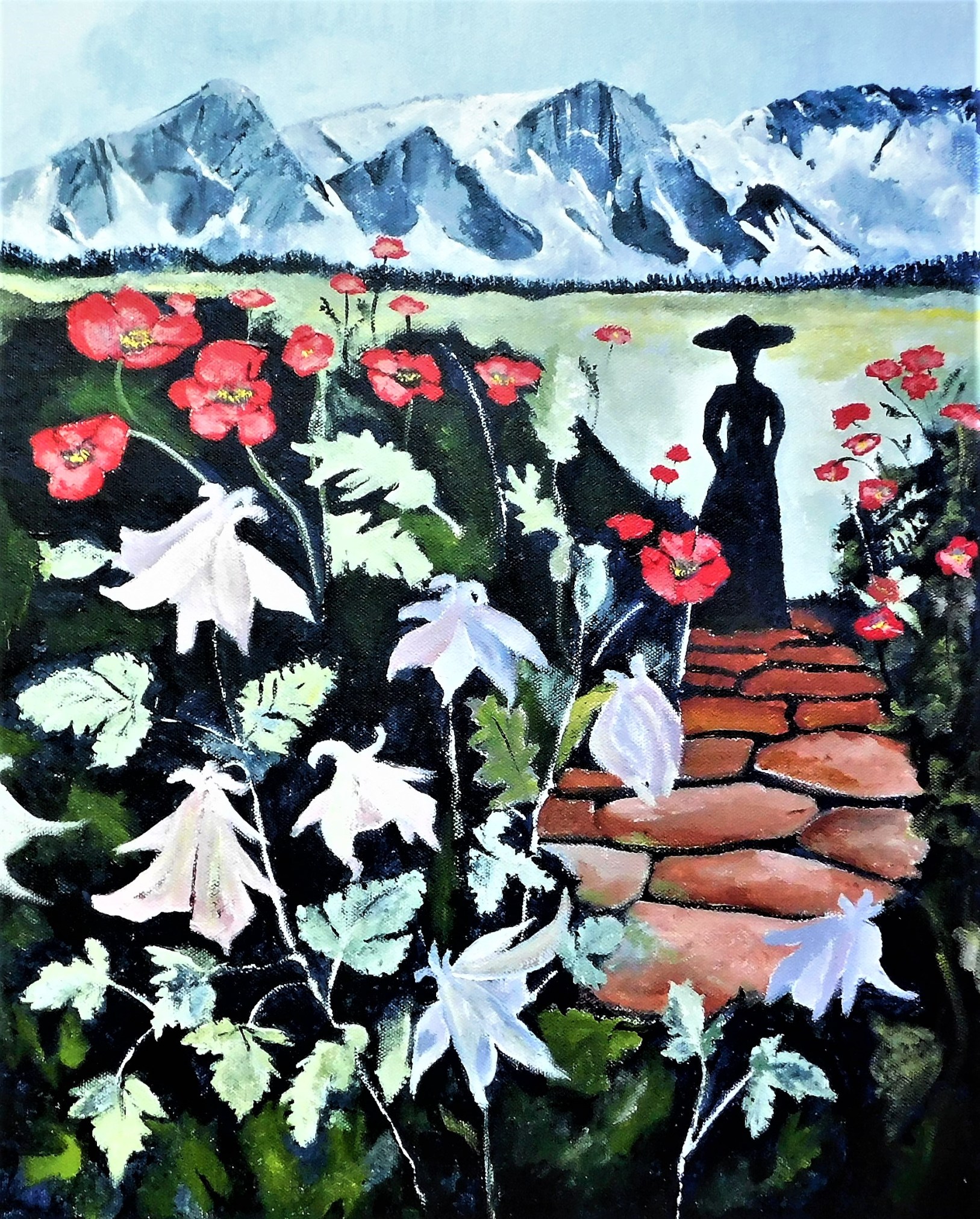 At first, I painted apple trees in the background, but the symbolism of the trees escaped me. So I removed the trees and added a scene from the Laramie area, featuring the nearby mountains (the Snowy Range), and a suggestion of foothills and plain. Now the silhouette of ‘Ella’ looks from her garden in the East towards the West. My uncle (her grandson) told me she never forgot the West and wished to return some day.