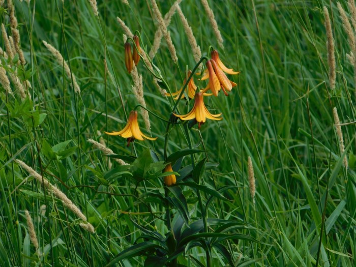 On a drive to Chipman today we came back via the old Trans Canada (now Highway 105) through Grand Lake Meadows. The Canada lily (also called meadow lily), Lilium canadense, is in bloom. Each plant holds its lily chandelier above the other field vegetation. They are bright orange with dark spots and hang downward.