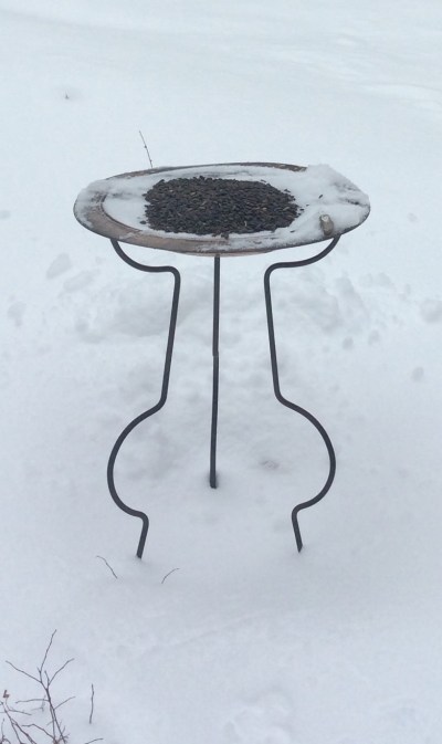 Presenting my new home-made feeder for sunflower seeds! I may add a simple roof to keep the snow out. I can replace it at intervals to keep it clean.