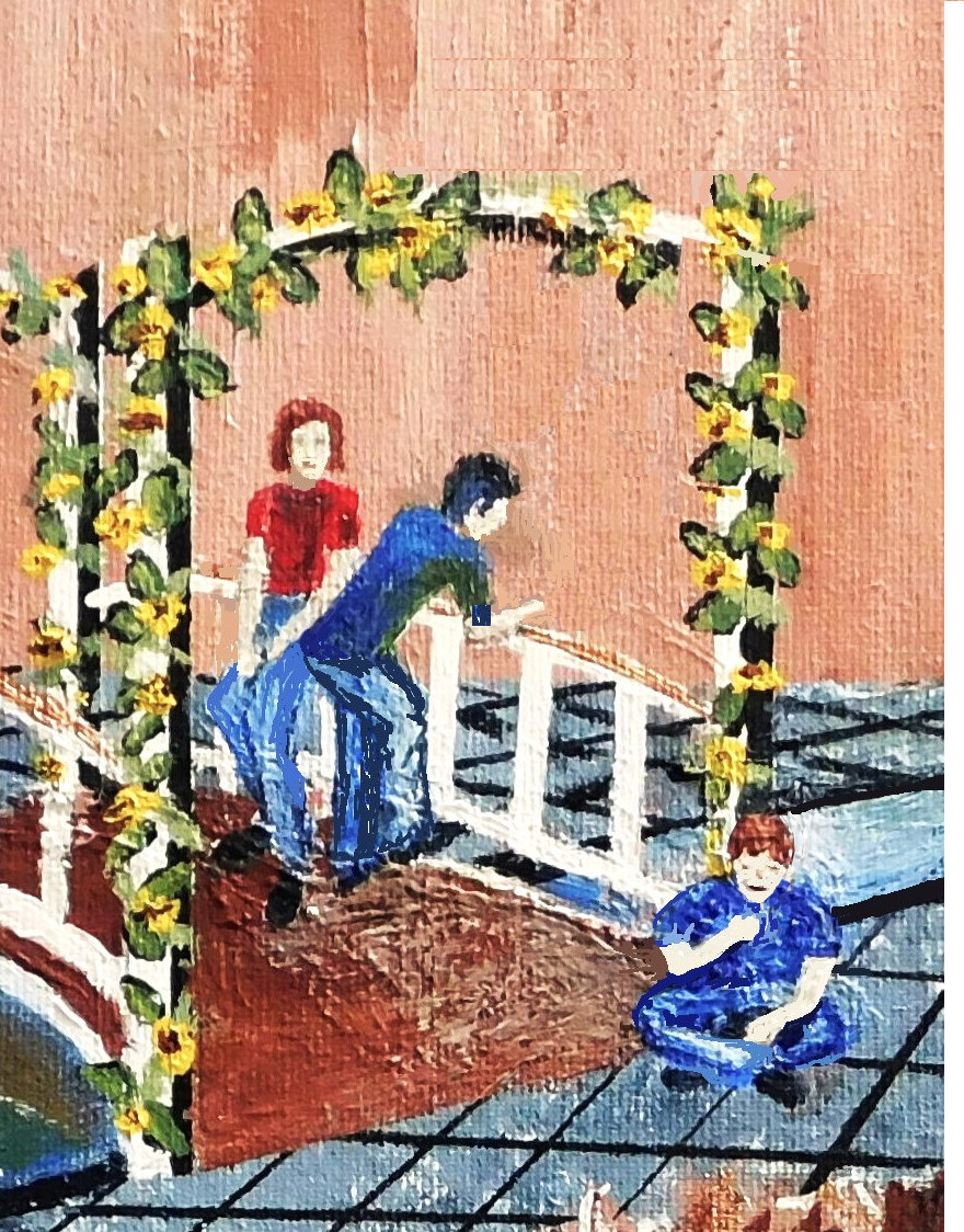 The image for the cover of the book is completed, an acrylic painting that shows some of the scenes within the old house – a house being used as a venue for weddings and anniversaries. The marble tiles are also featured in the cover image. Only a rectangular area of the painting will be featured on the book cover.