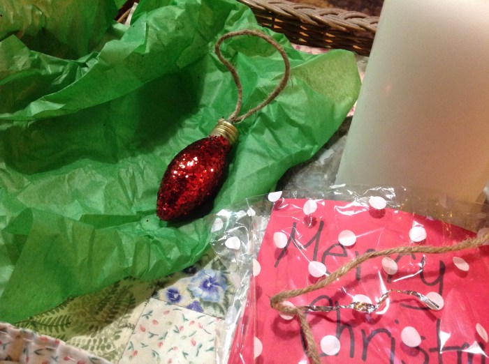 This afternoon I heard a tiny knock at the front door and arrived in time to see two children walking down our driveway. On the door handle I found a gift hanging! Very festive wrapping in a white dotted cellophane bag, a red card saying Merry Christmas and a gift wrapped in green tissue paper.