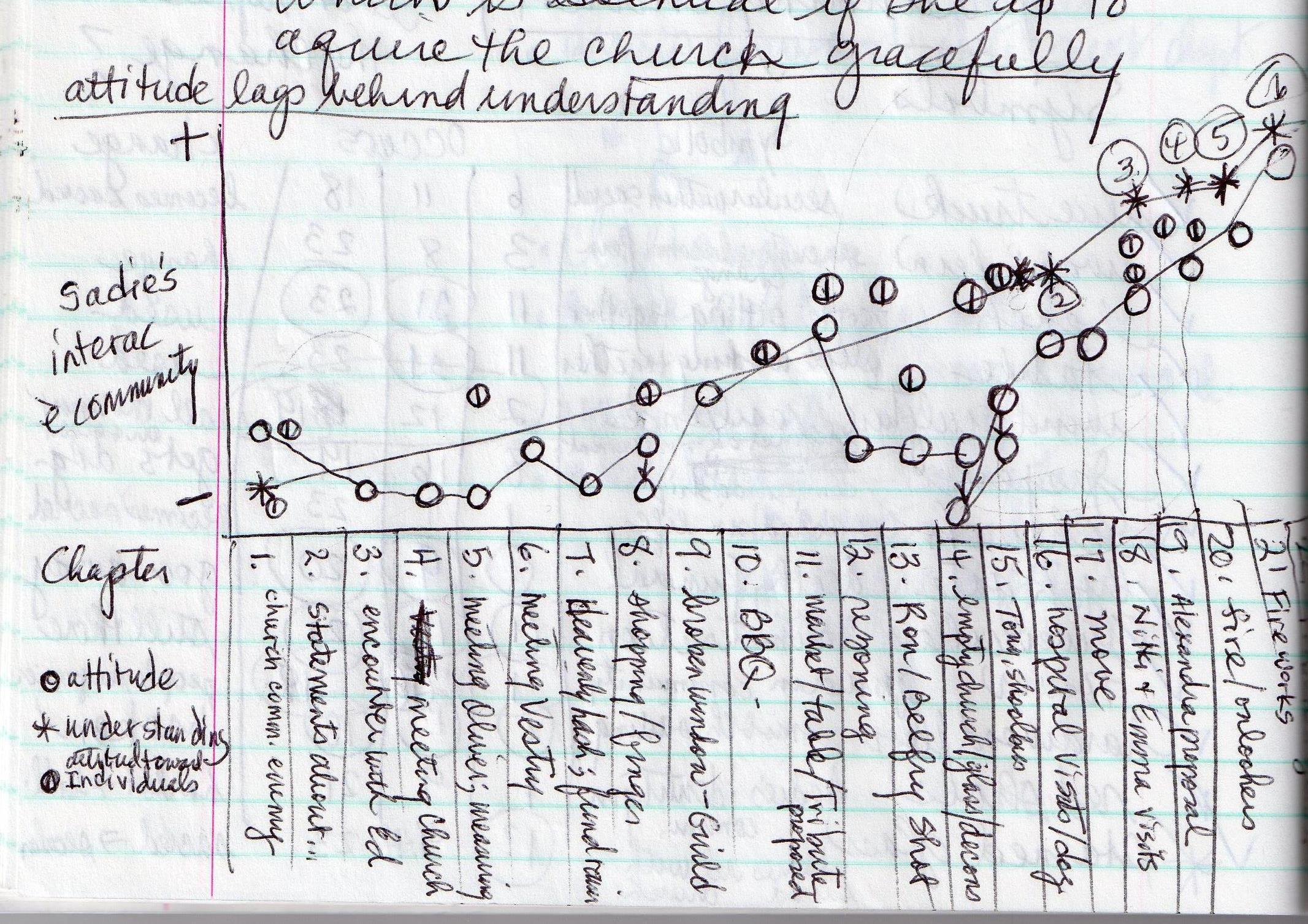 To make certain my main character is changing and growing in the right direction, I’ve plotted out her understanding, her attitude and her progress with respect to the community …