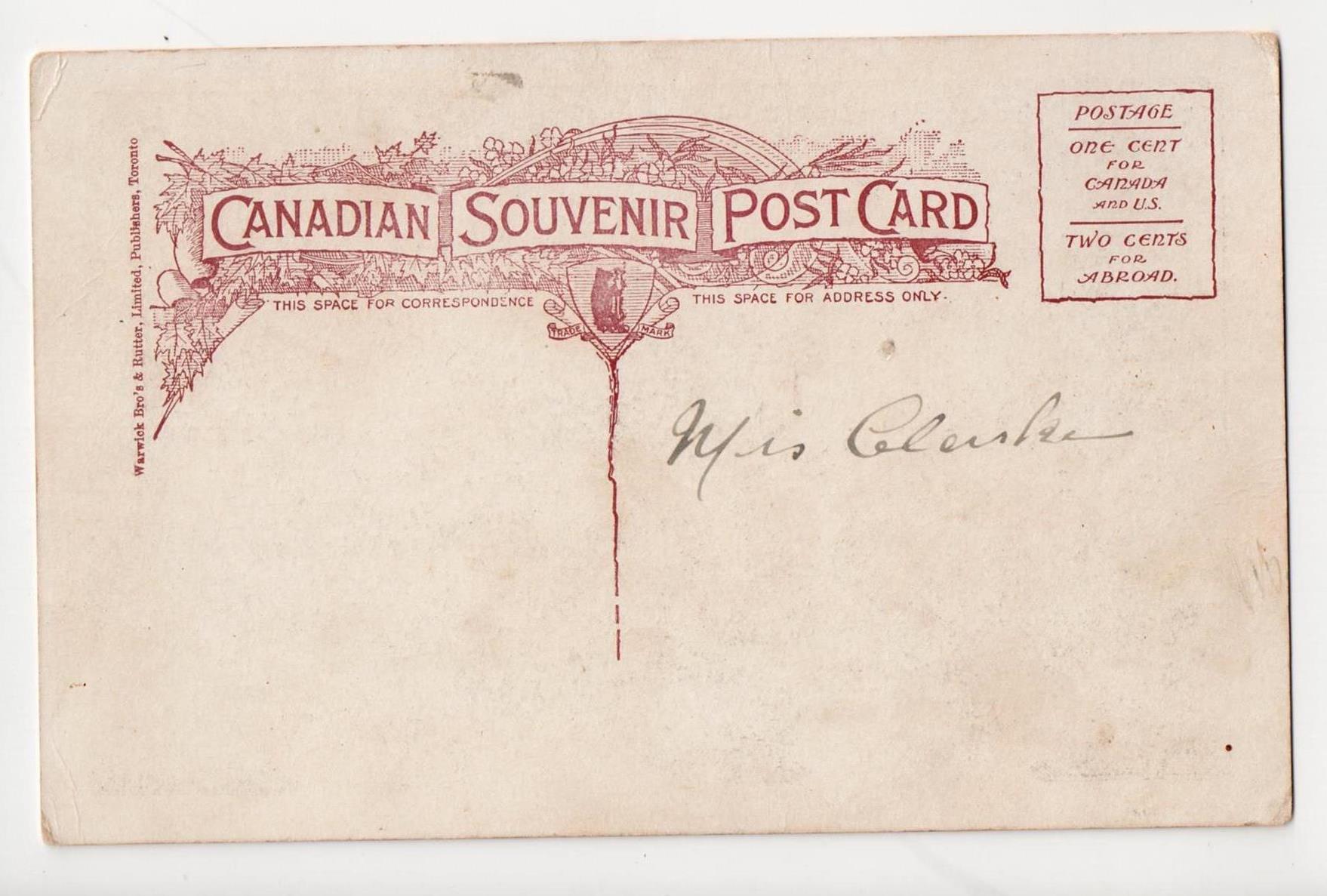 The stamps used to post the cards make an interesting study. In the early 1900s, it cost 1 cent to send a post card in both the United States and Canada. The postage requirements are printed in the upper right hand corner of this undated post card.