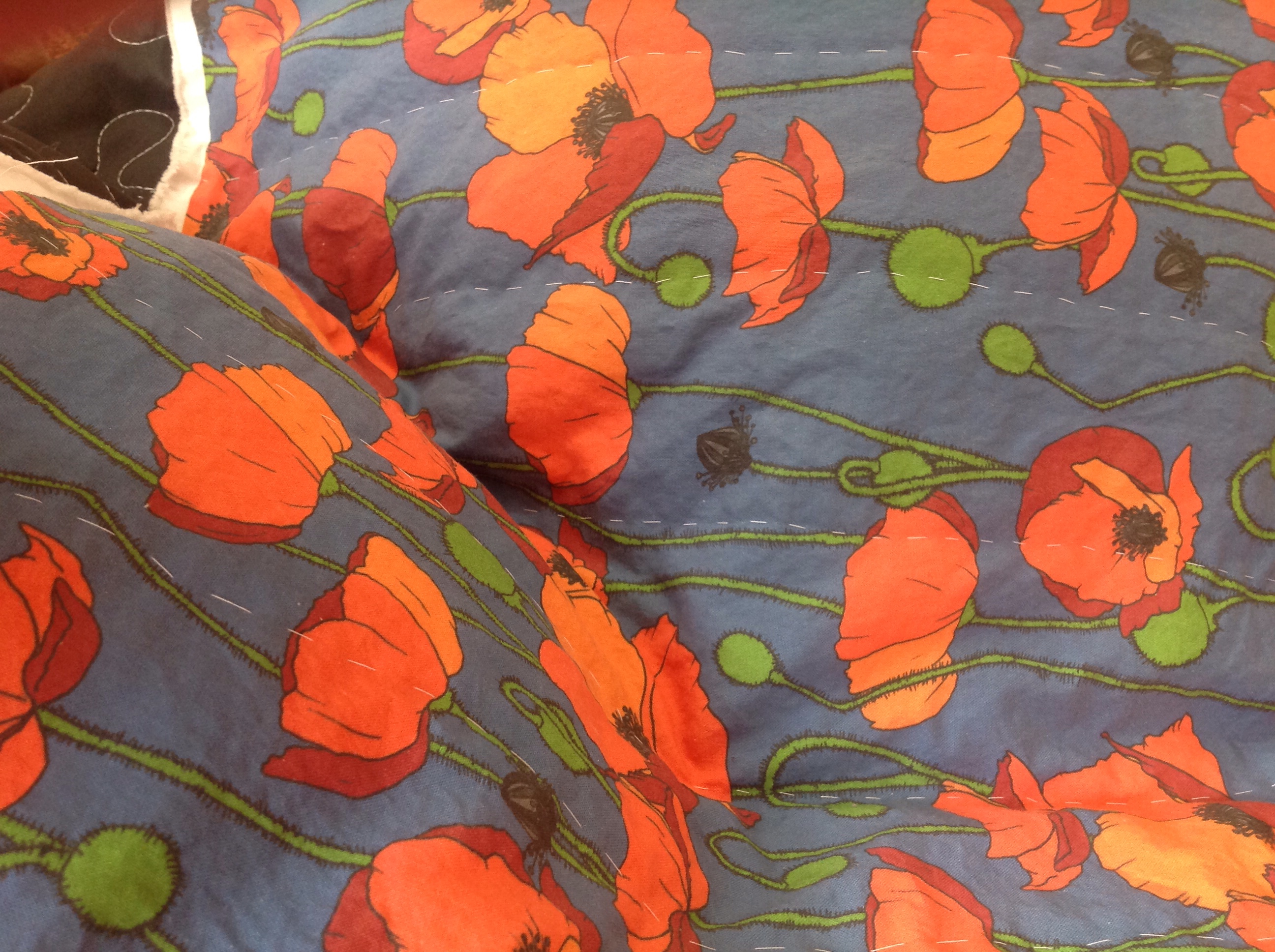 So I used the sheep quilt for the backing, sewing individual poppy squares over the sheep in rows. Very pretty although the colours are probably the result of my flower-child years.