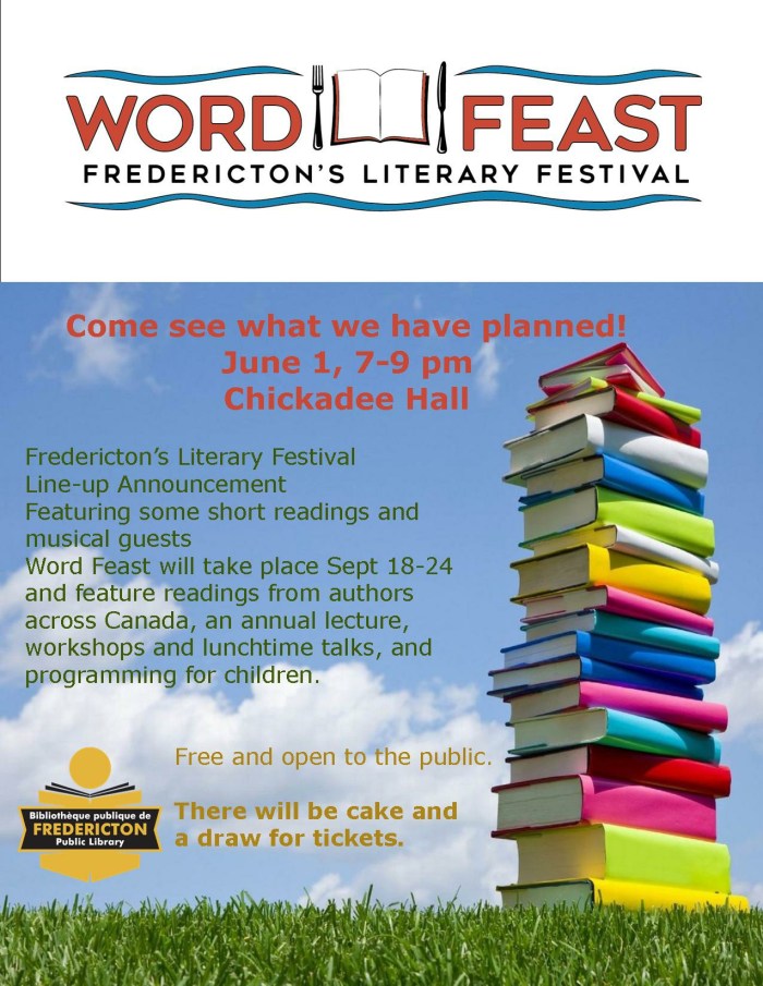This Thursday evening is the launch of Fredericton’s Word Feast, a literary festival to be held in Fredericton during the Week of September 18 – 24, 2017. Word Feast is expected to be an annual festival, featuring a lecture, workshops, seminars, readings, and other events.