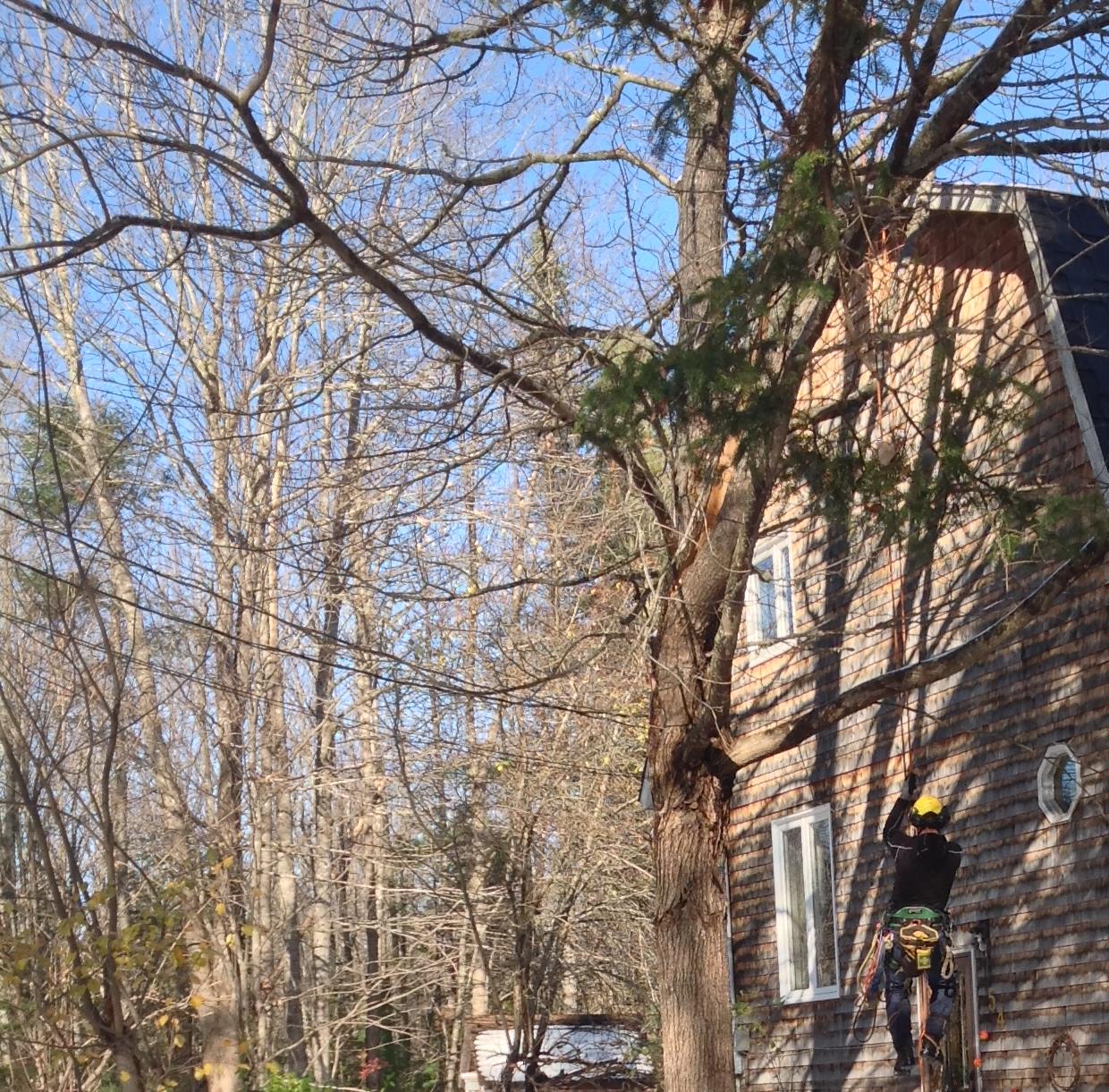 Then, as promised, Treecologic arrived, ladder, chain saws, climbing ropes and all. They worked for almost three hours, taking down a big white pine tree planted too close to the house and trimming branches from some of our other maples.
