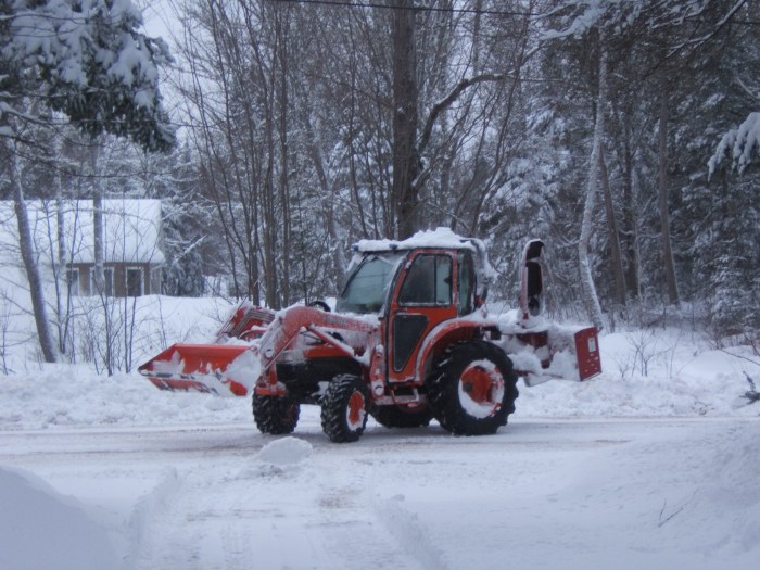 This year my husband has about 30 clients for snow removal and he has been getting ready for a couple of weeks — staking driveways, buying diesel, replacing lights in the tractor array, removing stressed bolts and moving things around the yard to make moving the snow as simple as possible.