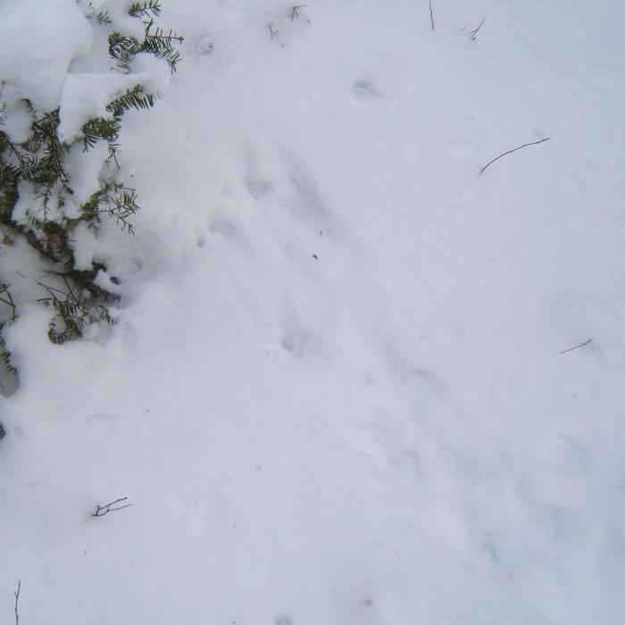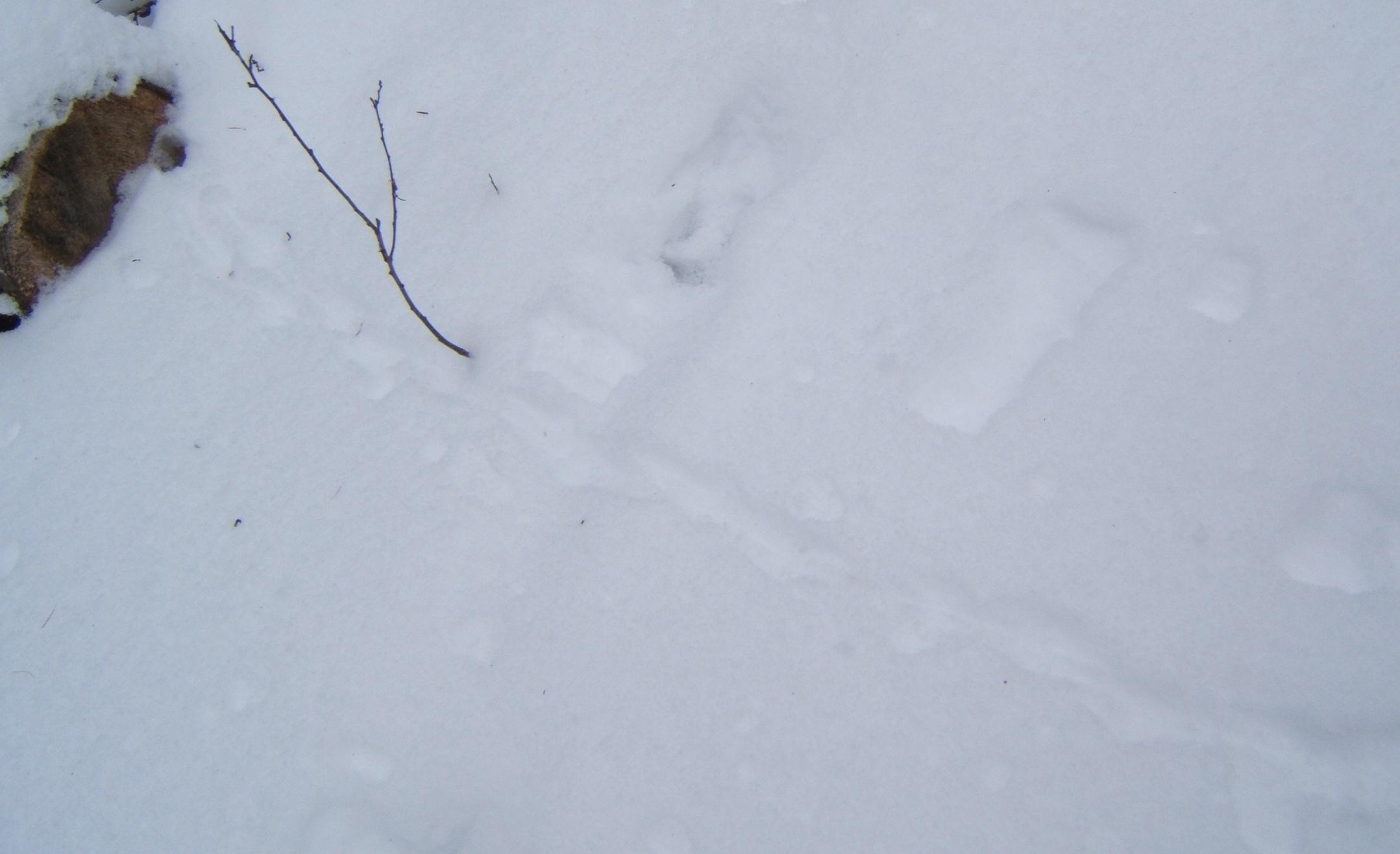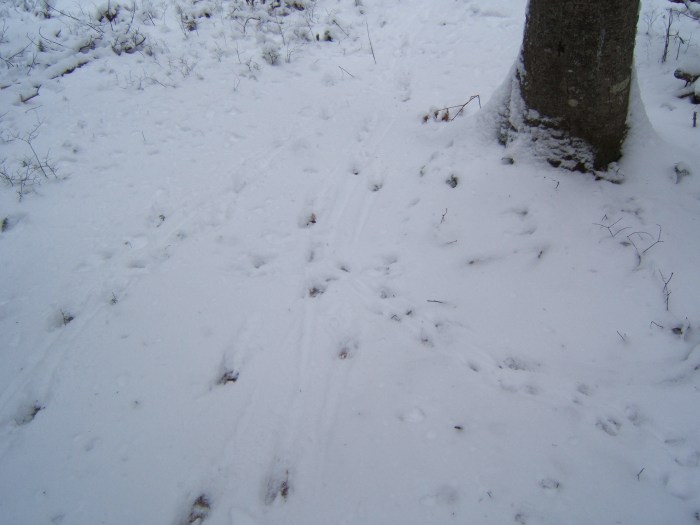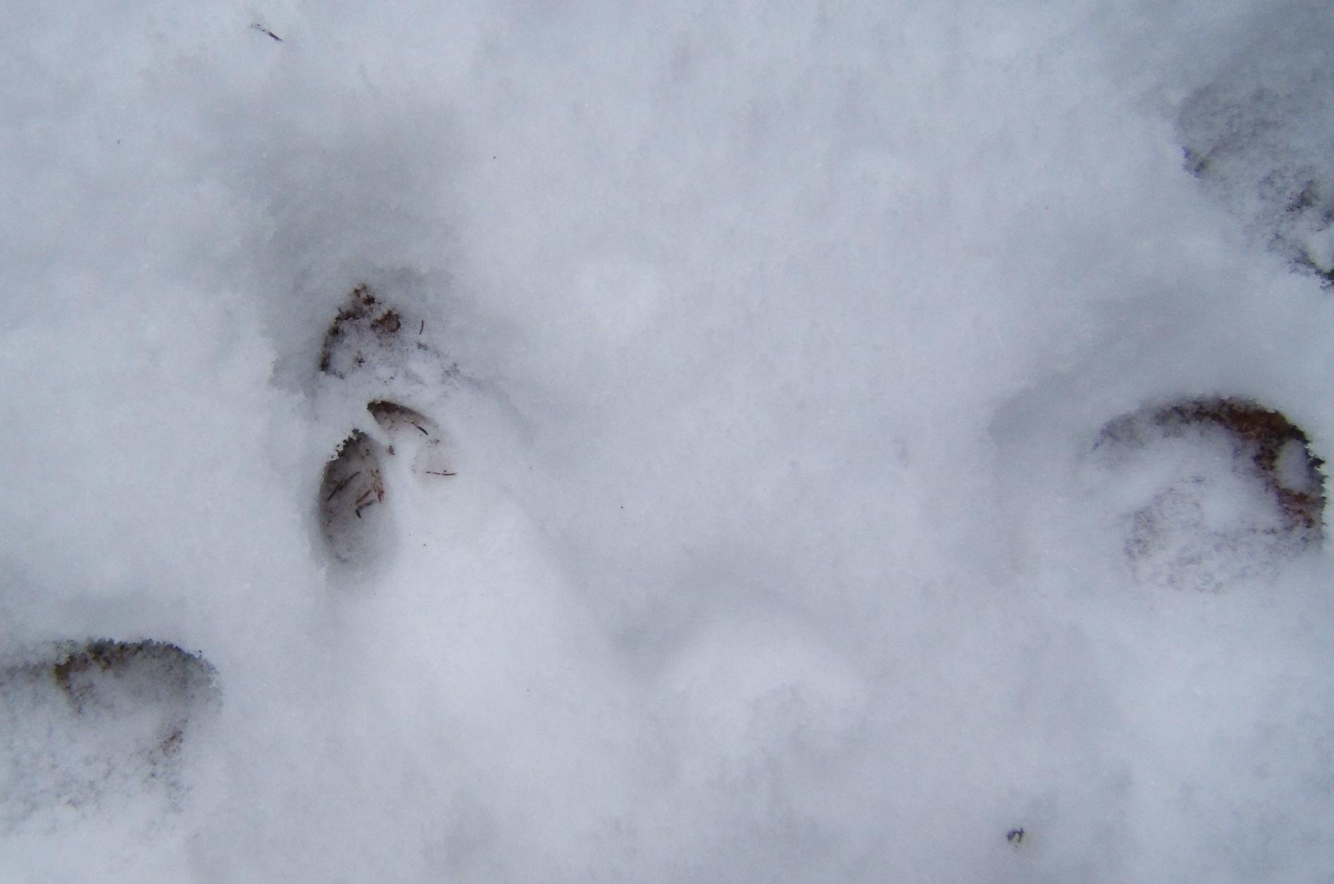 Squirrel tracks crisscrossed with those of deer…