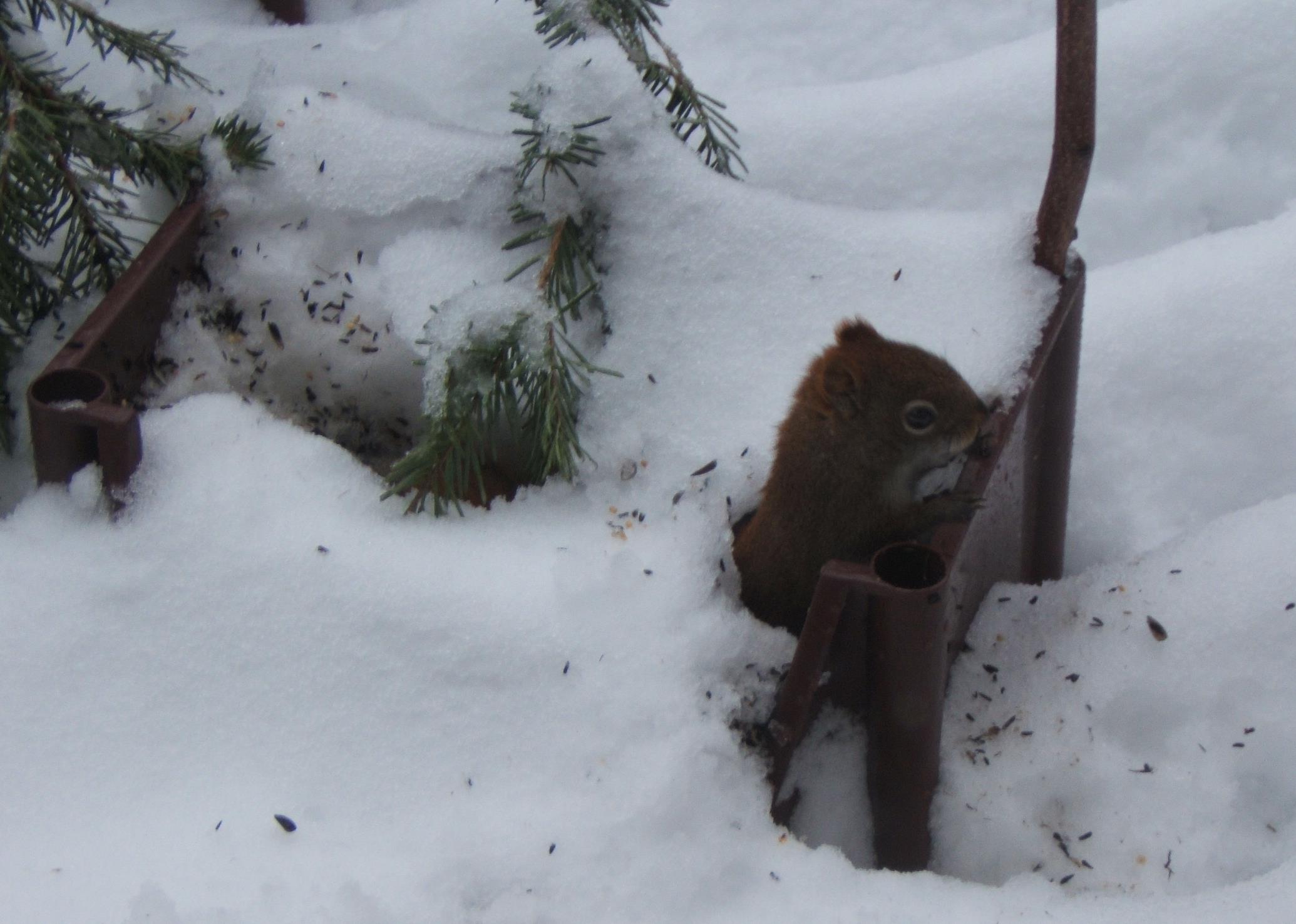 After one week, the squirrels and raccoon have left this feeder alone. They still have some food to eat at the other feeder, but at least the seed in this one is reserved for the birds! As you can see, the snow banks are getting higher and soon the squirrels will be skipping across the surface of the snow to reach the feeder. Higher please!