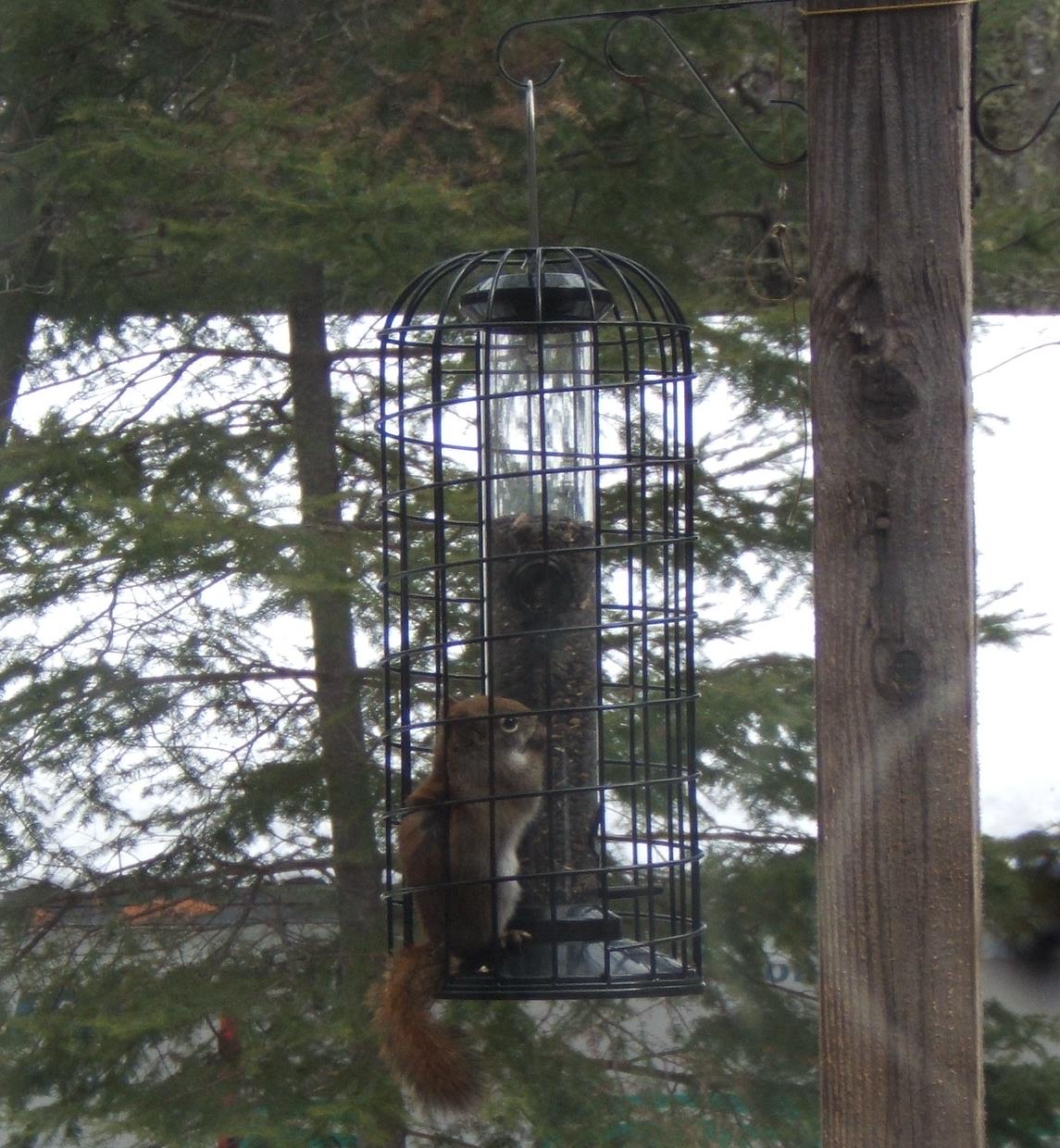 We have come to a conclusion – next year we will put up a mammal-proof feeder. My brother-in-law has it figured out. He has installed a large cedar post in an open area and encased it in aluminum pipe and flashing. Enough seed falls on the ground to give a treat to the squirrels and other marauders, and the birds are the focus of the money-drain.
