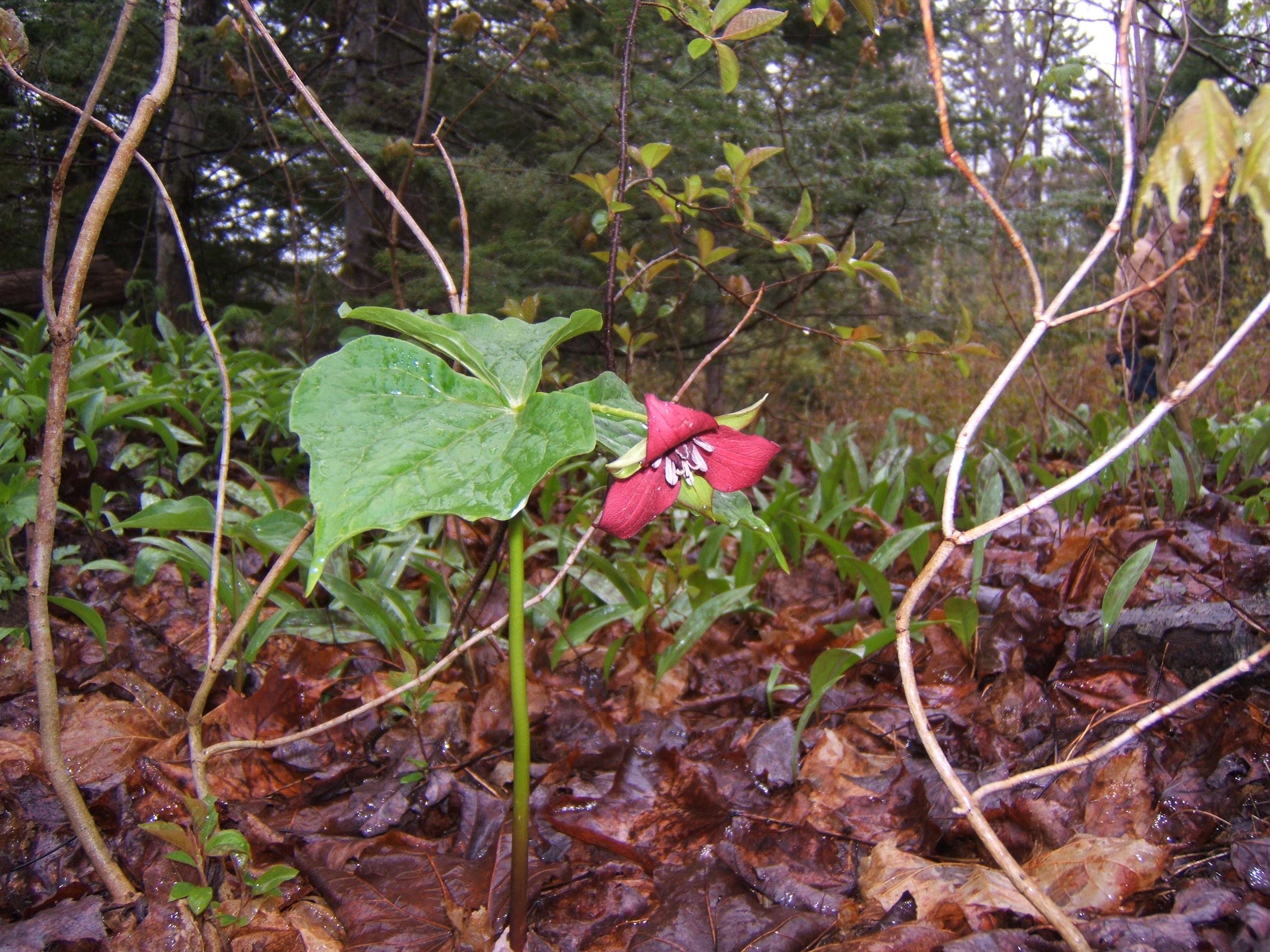 The Purple Trillium (Trillium erectum L.), also known as the Wakerobin, is a showy plant with the parts in three’s. The flower is maroon or purple, and, as in our case, may be nodding, in spite of the name (erectum meaning erect). The flower is known by its purple ovary (female part of the flower) and its nasty odor. You can eat the very young leaves of the Purple Trillium, but they are not usually in large abundance, so to protect the plants, I recommend just enjoying their bloom.