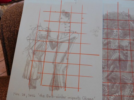 Third step: Transfer the drawing outlines to the cardboard. To do this I created a grid on the drawing and a scaled grid on the cardboard. Then I just drew a scaled outline using the grid-lines.