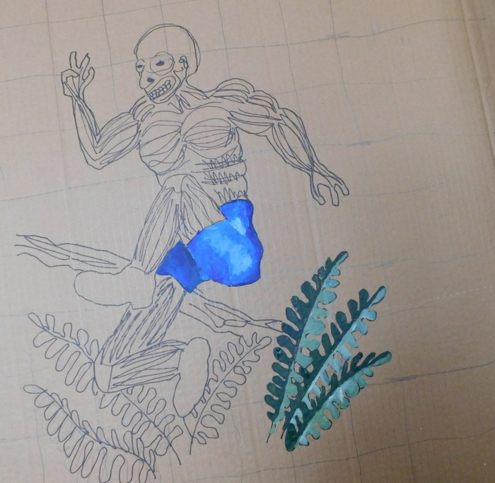 Fourth step: Paint the cardboard figures. Manipulating the cardboard during painting was the hard part. I just used my exercise ball to elevate and steady the figure. I was afraid the cardboard would bend, but no mishaps occurred!